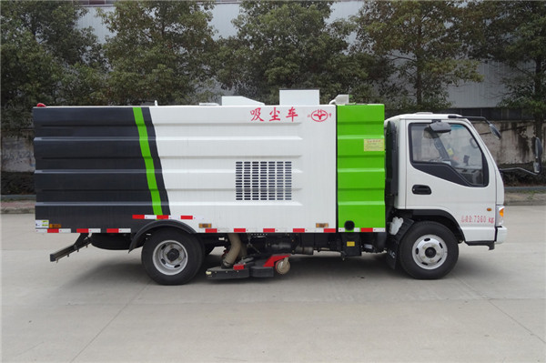 該吸塵車是采用江淮型國五二類原廠汽車底盤改裝,加裝副發動機、風機、清水箱、垃圾箱、中置吸盤,工作視頻探頭,自動脈沖清理功能,液壓系統、專用裝置電控系統和副車架等改裝而成。