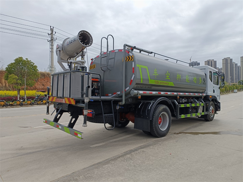 東風15-16噸霧炮灑水車產品標配前噴(鴨嘴)、后沖、后灑、側噴、后置式工作 平臺,平臺上配置綠化水炮(可 360°旋轉,既可以調成柱狀,也可 以調成霧狀,更可以調成直沖狀、大雨、中雨、小雨、毛毛雨),配 備優質大功率專用灑水泵(可自吸自排,可從河里或池塘抽水到罐體), 取力器,雜物過濾網,消防接口,自流球閥系統、取力器、球閥、濾網 均為國家標準產品,主管道加粗,法蘭墊、法蘭盤加厚,大通徑球閥。 整體具備性能優良安全可靠、效率高、流量大、維修方便等特點
